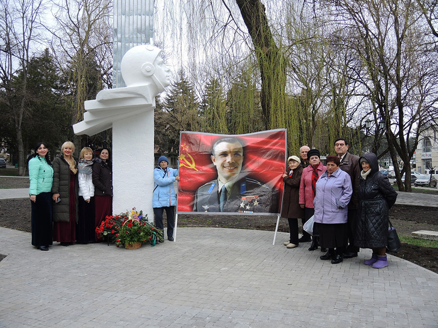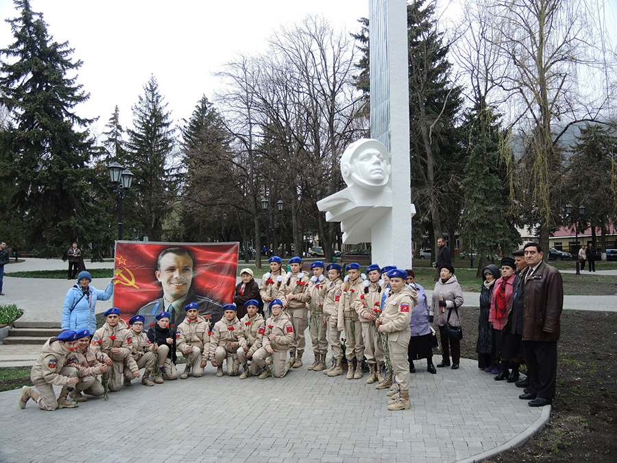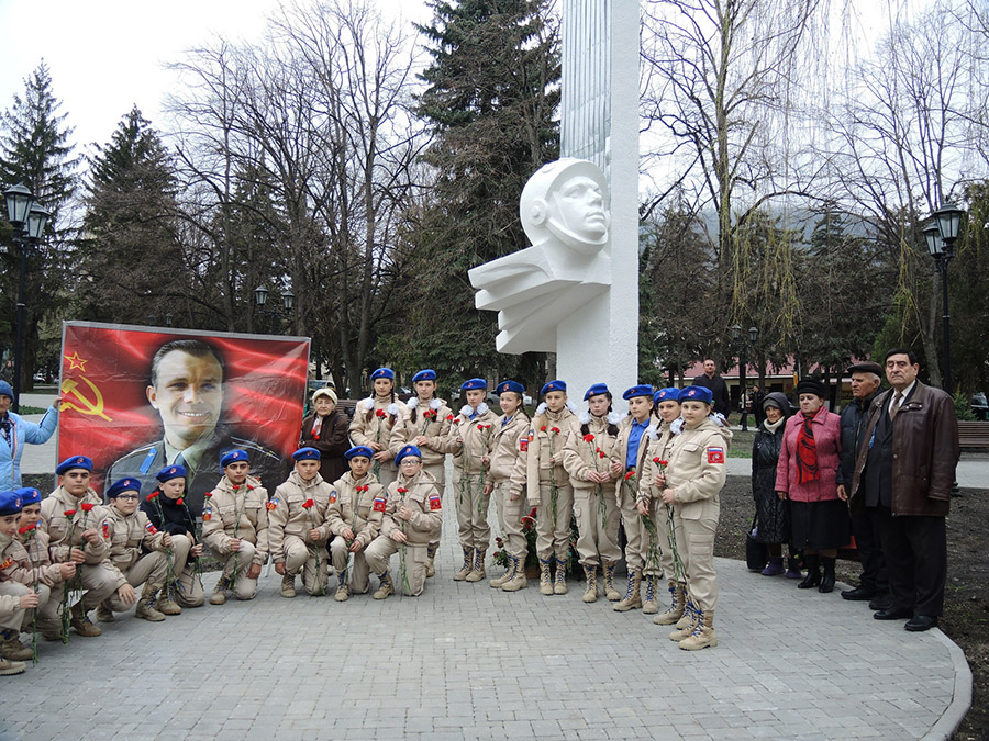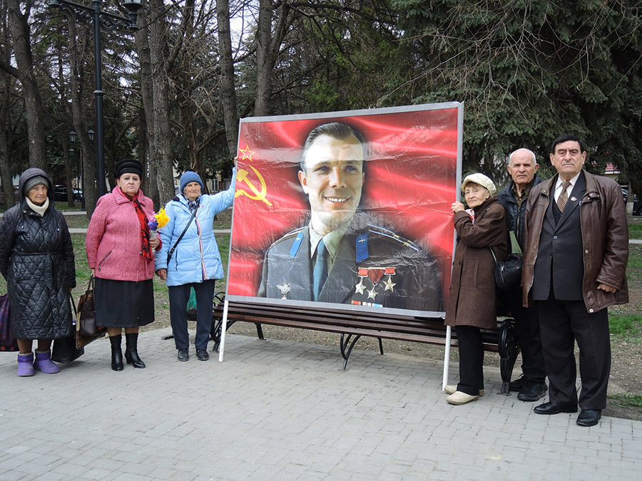 Был выставлен баннер с портретом Ю.А. Гагарина на фоне красного знамени с серпом и молотом, у которого с удовольствием фотографировались участники возложения цветов, жители города и школьники...