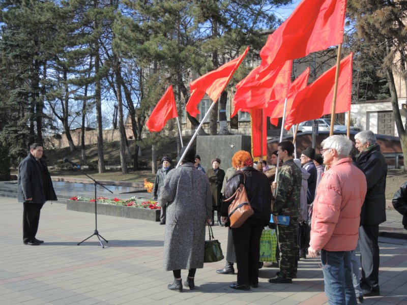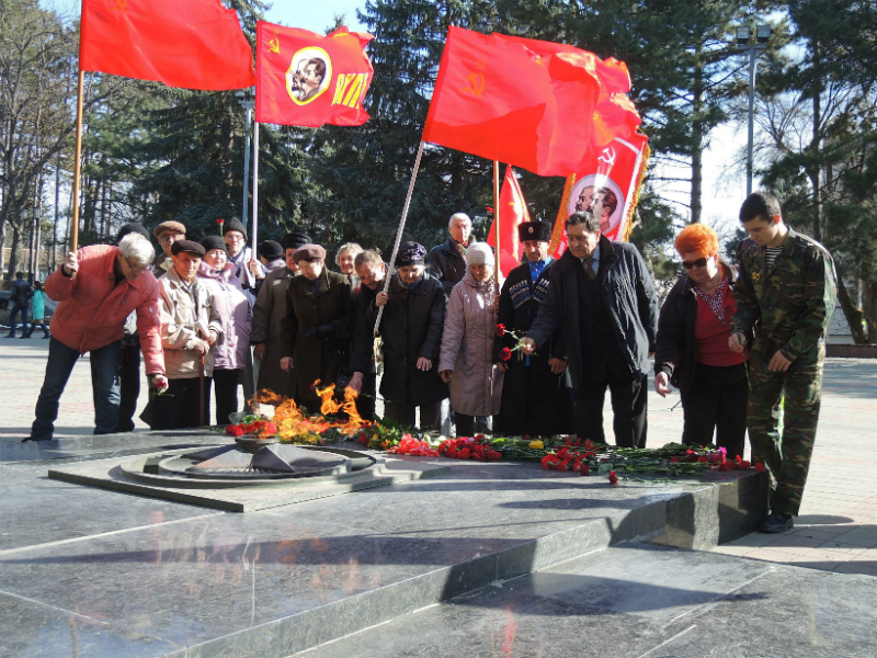 к « Огню Вечной Славы». До начала митинга звучали песни, славившие Красную Армию и генералиссимуса СССР И.В. Сталина, распространялись газеты « Большевистский Серп и Молот» и « Революция», проводилась агитационная работа.
